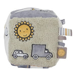 Op elke zijde van de kubus is iets anders te ontdekken zoals leuke afbeeldingen, verschillende stoffen, labeltjes om aan te voelen,