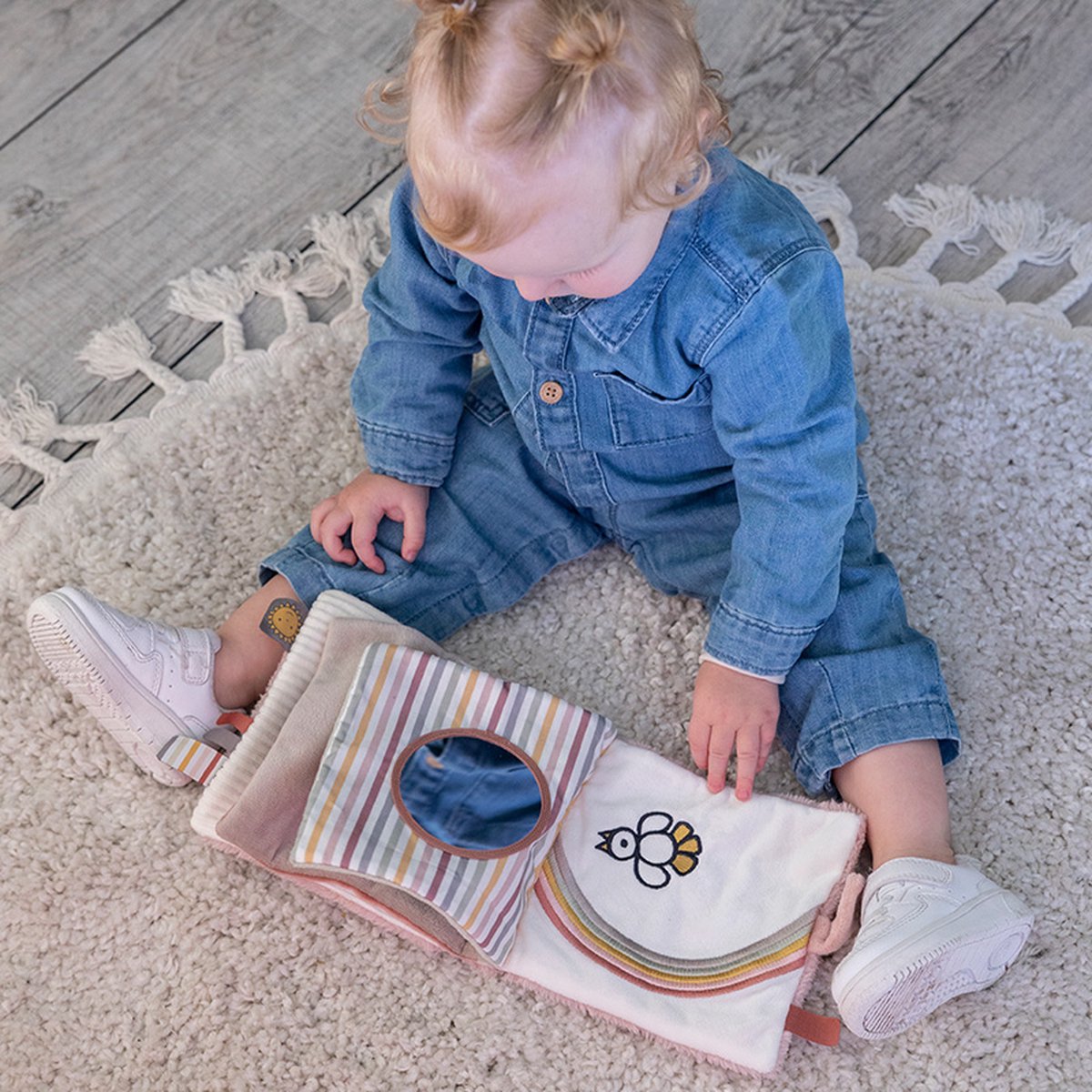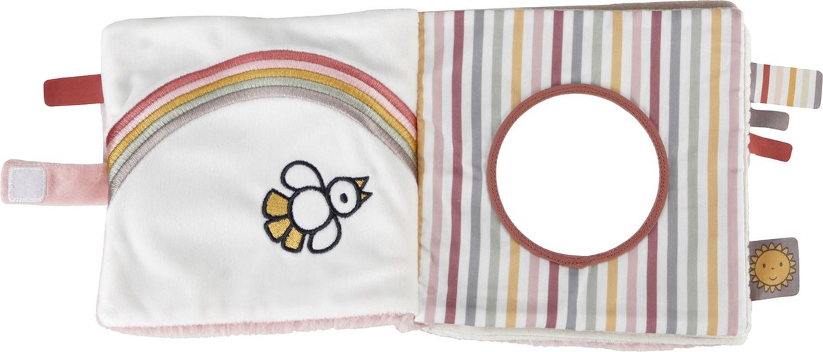 Er zijn tal van activiteiten te ontdekken zoals knisperpapier, een spiegeltje, een flapje en labeltjes om aan te voelen.